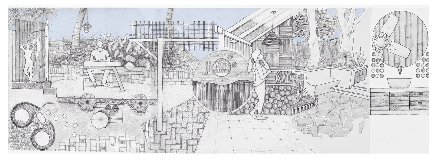 The Casuarina Showers: Upon entering from the beach, guests are met with outdoor showers crafted from local Casuarina poles. These perch gracefully on the sand, framed by a natural backdrop of Pandanus trees.