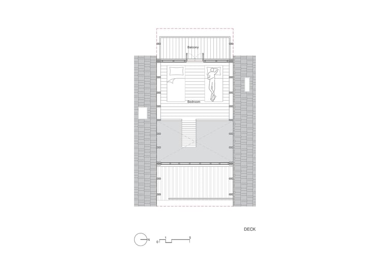 Traditional carpentry & joinery (No metal framing used), Mezzanine bedroom deck, skylit bath court, and cantilevered balcony.