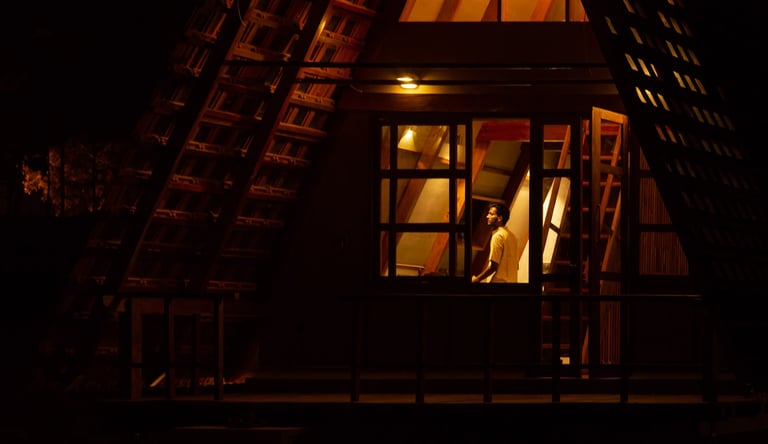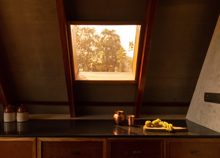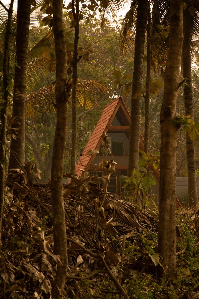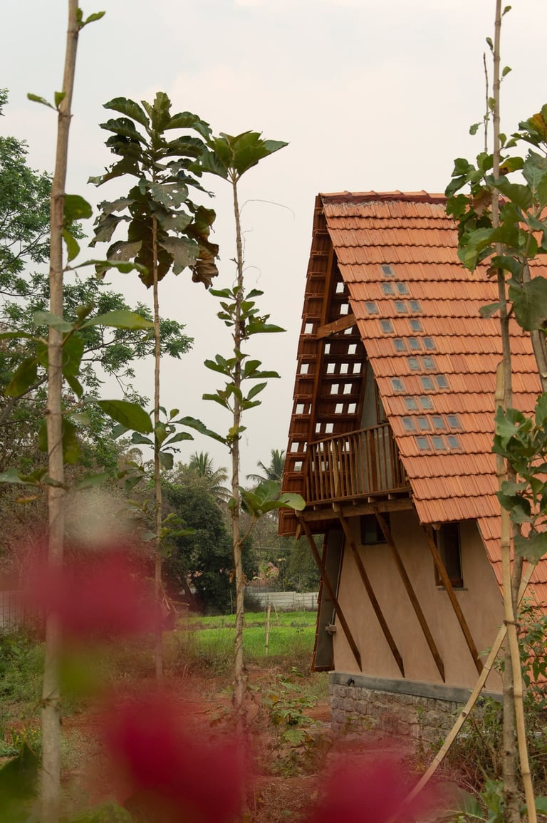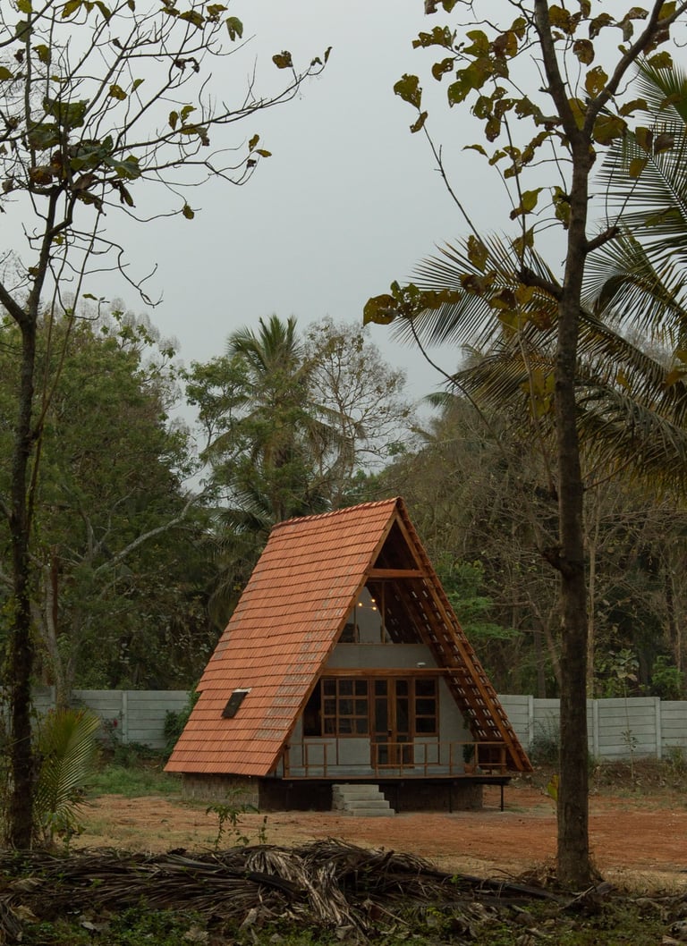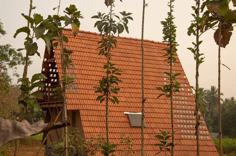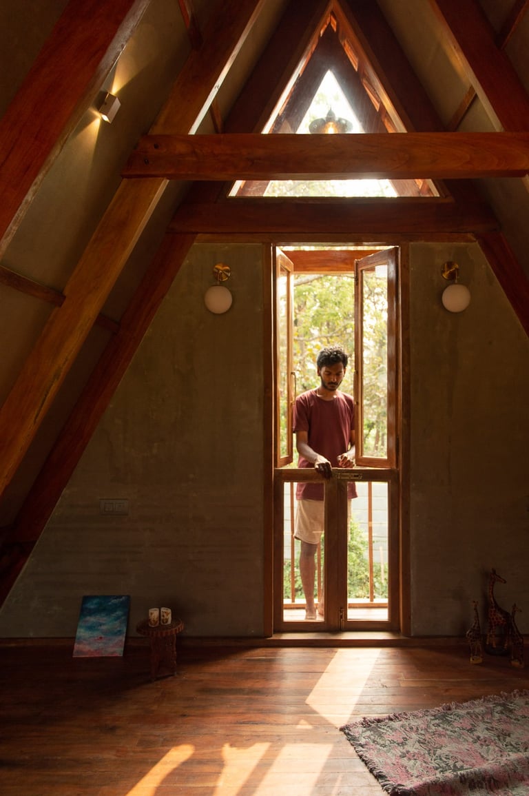 In search of peace, one often looks toward the mountains. Solitude was born from this singular idea - a 710 sq. ft. wooden cottage perched on a grassy patch amidst a teak plantation. Designed as a restful retreat for a former doctor, this A-frame sanctuary offers a feeling of deep rootedness and quietude.
