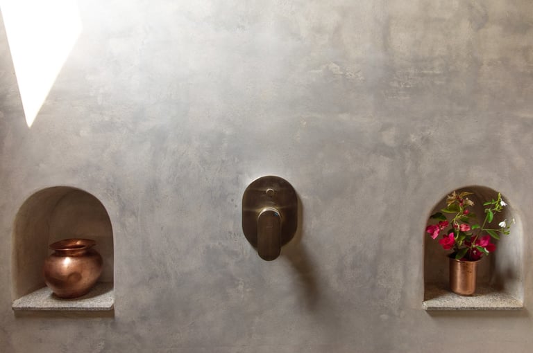 Earthen Finishes: Interior surfaces are draped in white oxide and lime plaster, while local stone, terracotta, and mud from the site ground the building in its context.