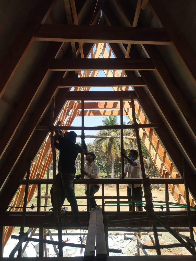 Indigenous Red Cedar Wood, Burnt Bricks, Mud Plaster.