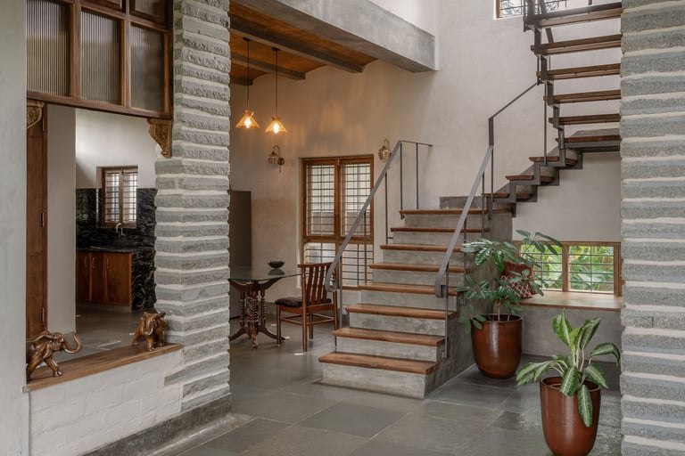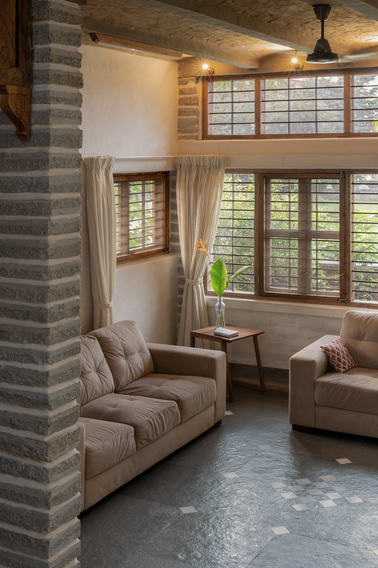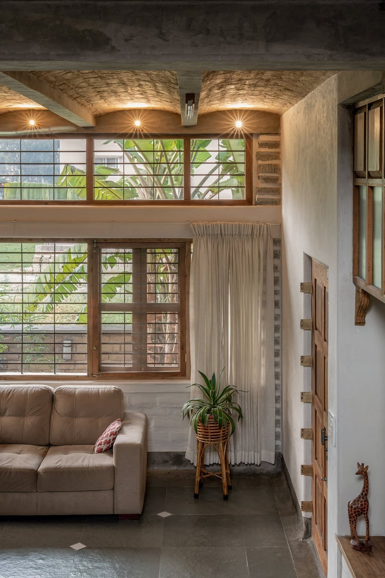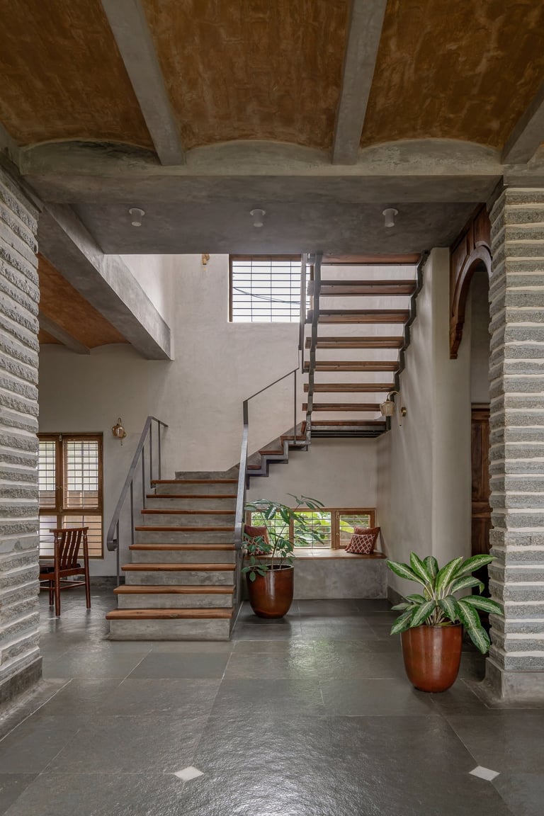 Thermal Mass: Nine-inch hand-cast stabilized mud blocks (SMB) hold warmth in the winter and release the Bengaluru summer heat.