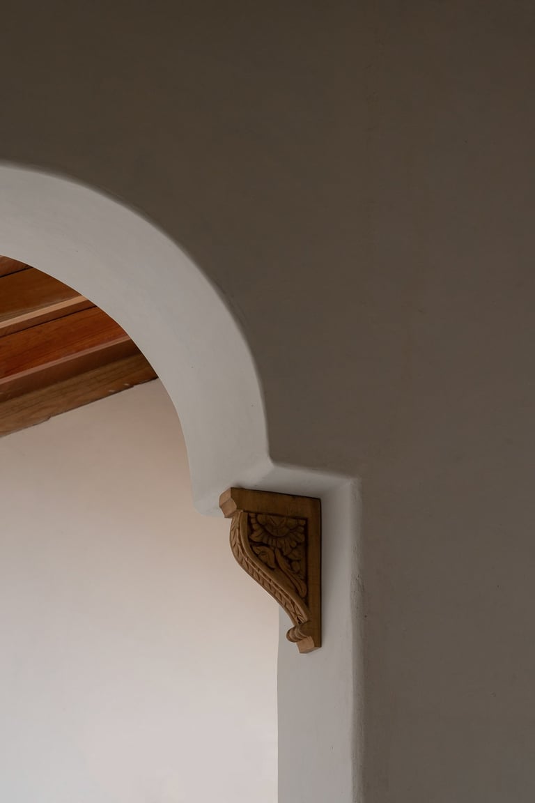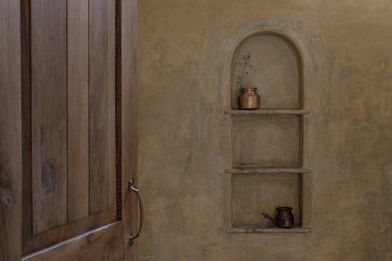 Milky Lime Plaster: Inside, walls are coated in a soft, white lime plaster that glows in daylight. The subtle tonal variations reveal the movement of the mason’s hand, giving every surface a life of its own.