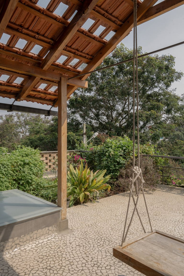 The Productive Terrace: A rooftop garden extends the home's relationship with the earth, providing fruits, vegetables, and herbs for traditional kashaya and daily meals.