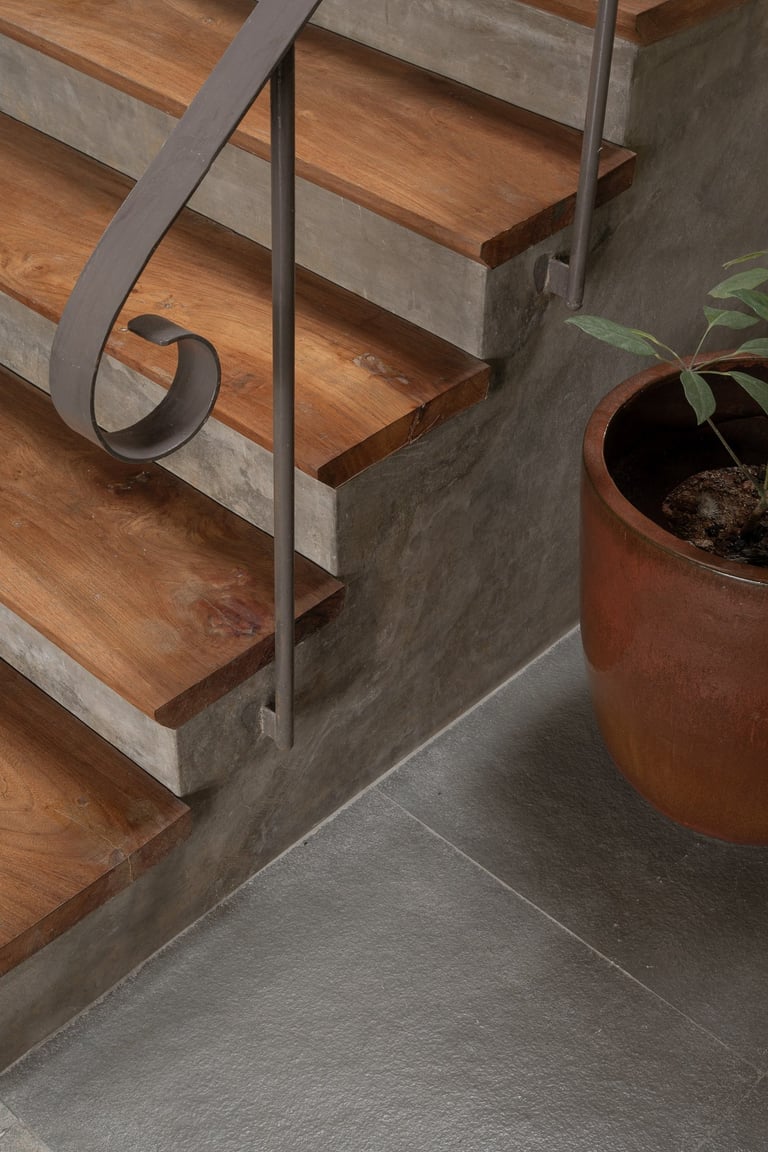 Tactile Textures: Floors are finished in leather-textured Kota stone, providing a practical, anti-skid surface for aging gracefully while shimmering like water under the grazing sun.