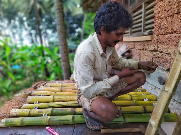 Laterite blocks, Thatch, Glass Bottle Masonry, Bamboo, and Oxide Plaster.