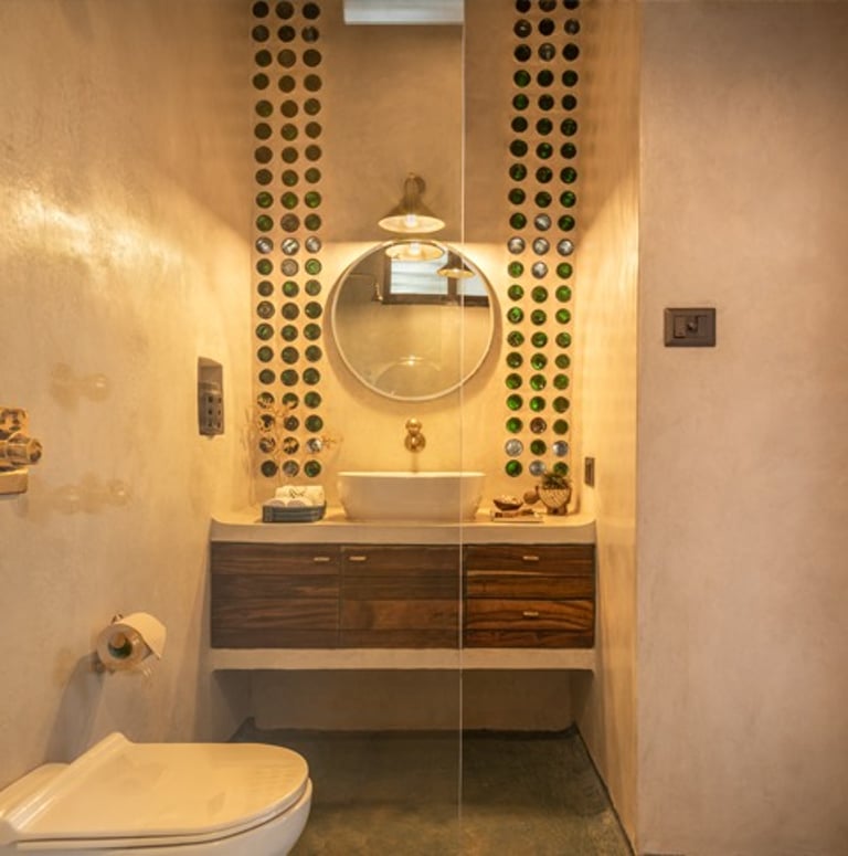 Living Masonry: In the bathrooms, we integrated glass bottles into the masonry, creating walls that glow with soft, diffused light.
